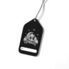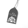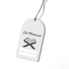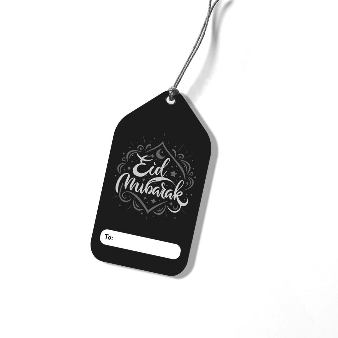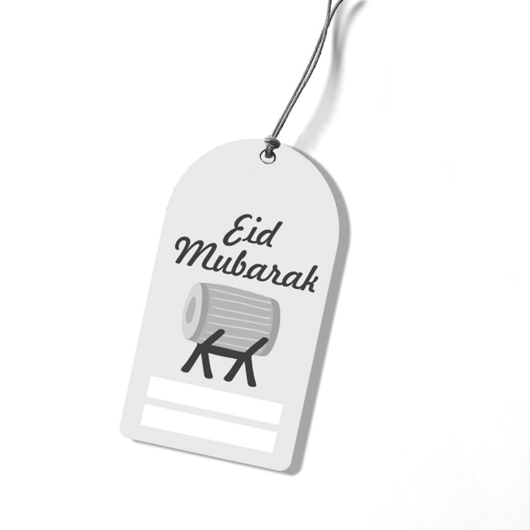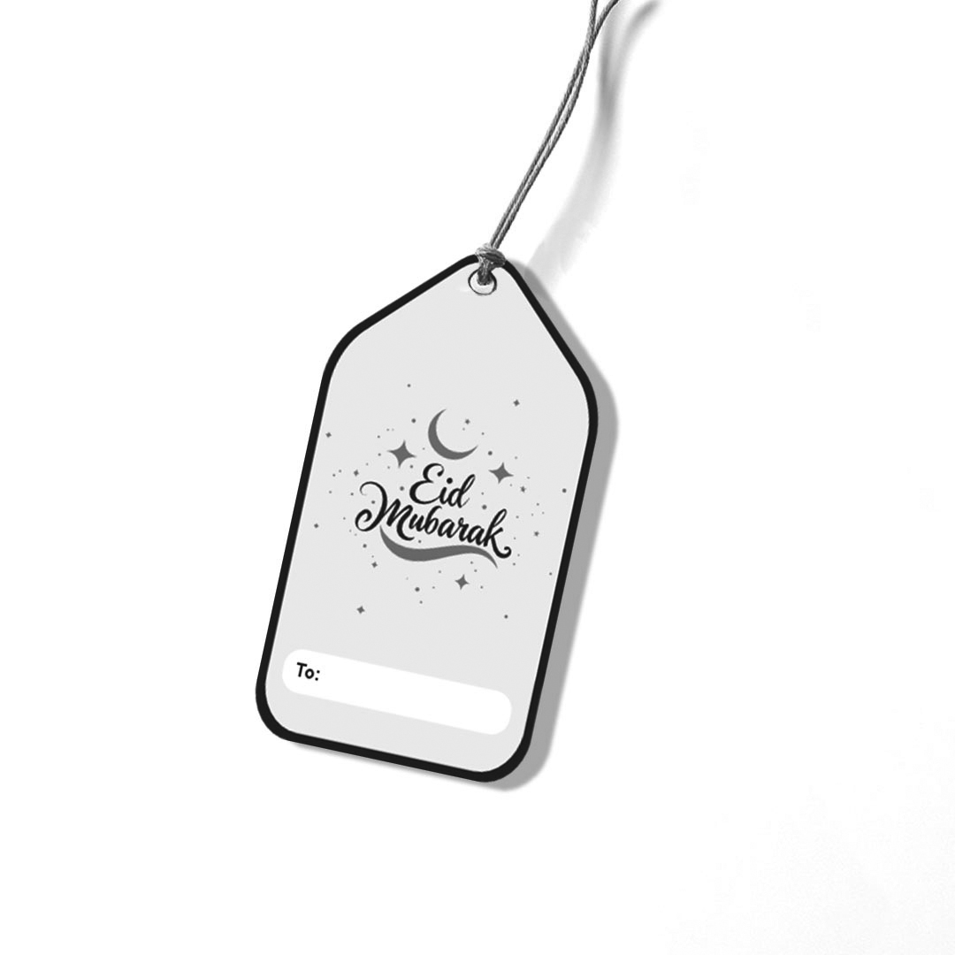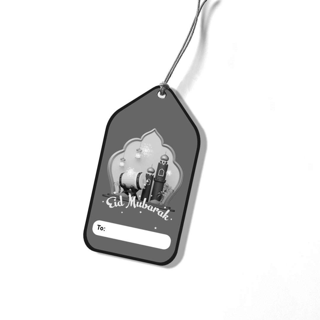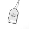 a small card, typically paper or cardstock, attached to a product with a string or pin to provide information like brand details, product features, price, and care instructions.